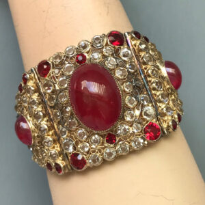 bracelet with green rhinestone accents all set in gold tone, 7" by 1".