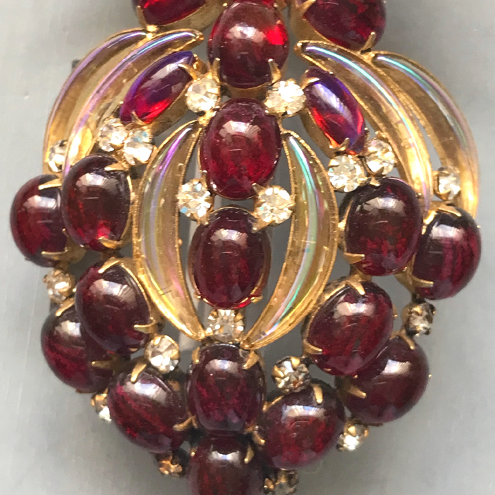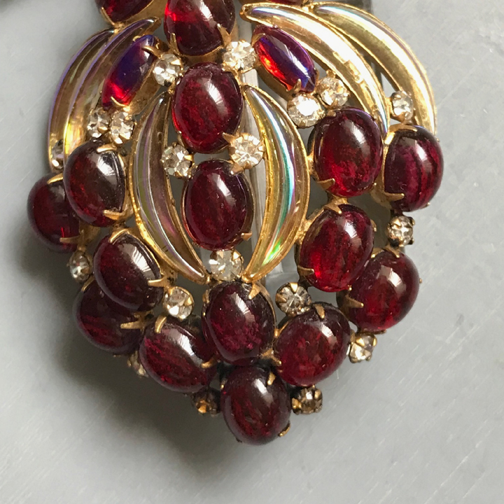 glass cabochons and clear rhinestones with iridescent glass leaves, marked on the back "Mimi Di N ", 3-1/8" by 2".