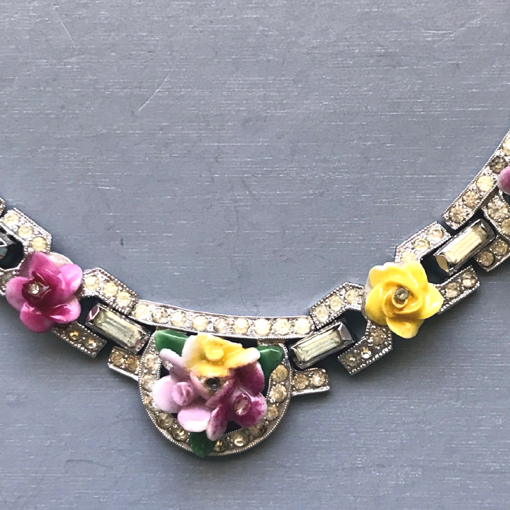 clip with a white, pink, blue and yellow enameled flower bouquet in a clear