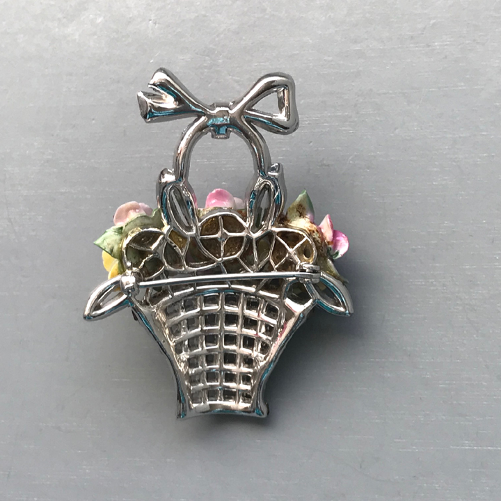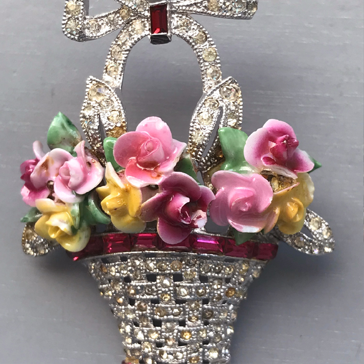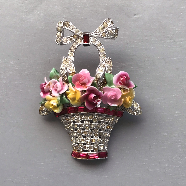 DEROSA magnificent peacock and flower basket fur clip marked "R DeRosa"