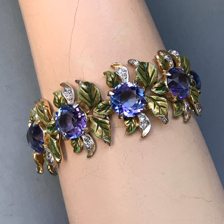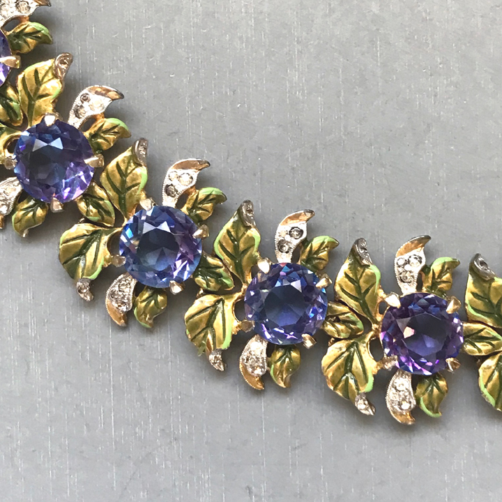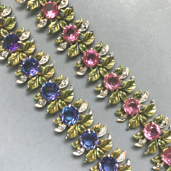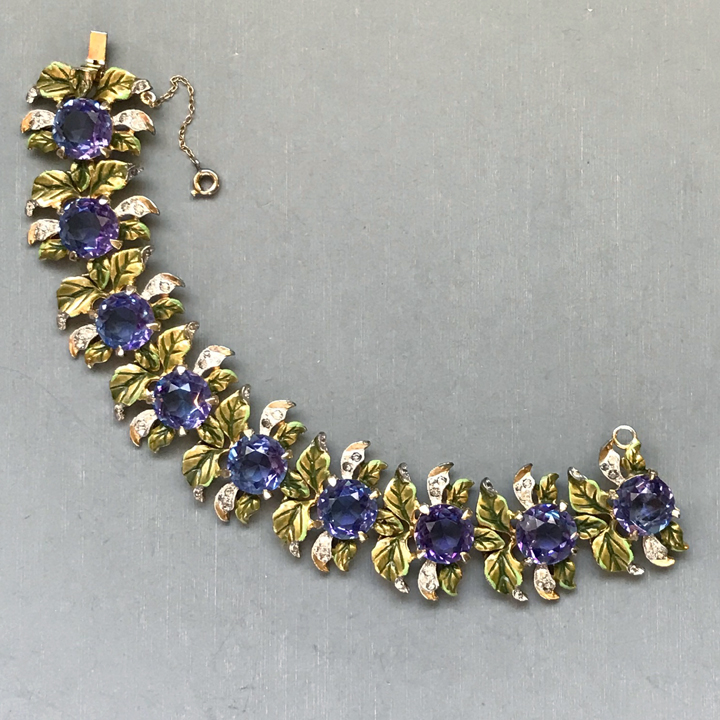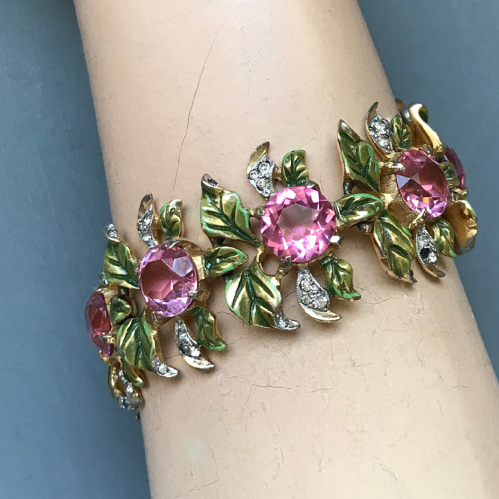 wonderful bracelet of pink rhinestones and green enameled leaves