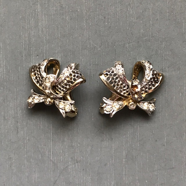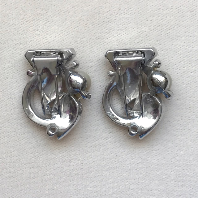 plated setting with clear rhinestone accents, 7/8" clip backs. I have seen both DeRosa