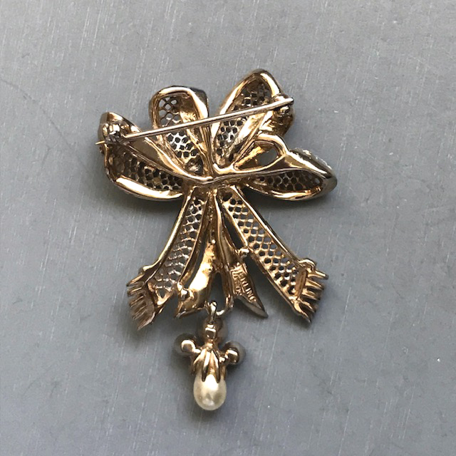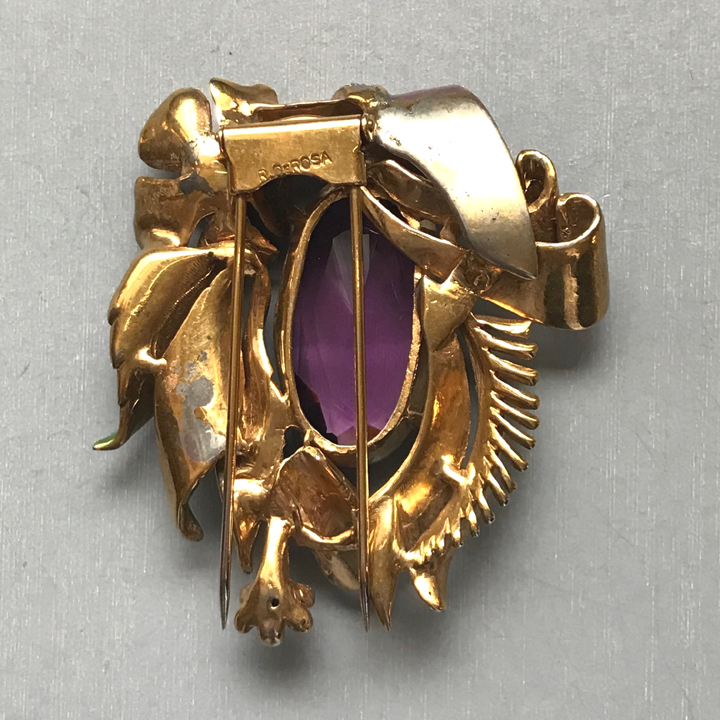 purple rhinestone body and artificial pearls, circa 1944, 2" by 2-3/4".