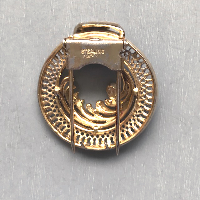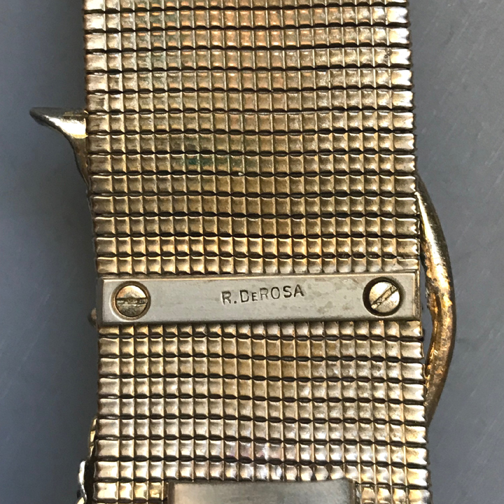 front and a gold plated finish on the back, signed "R DeRosa", 3" by 2".