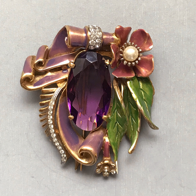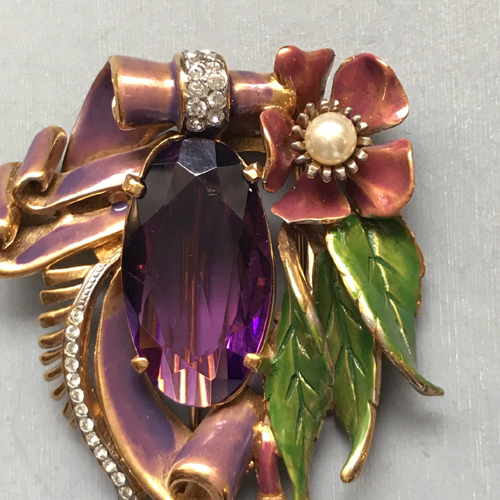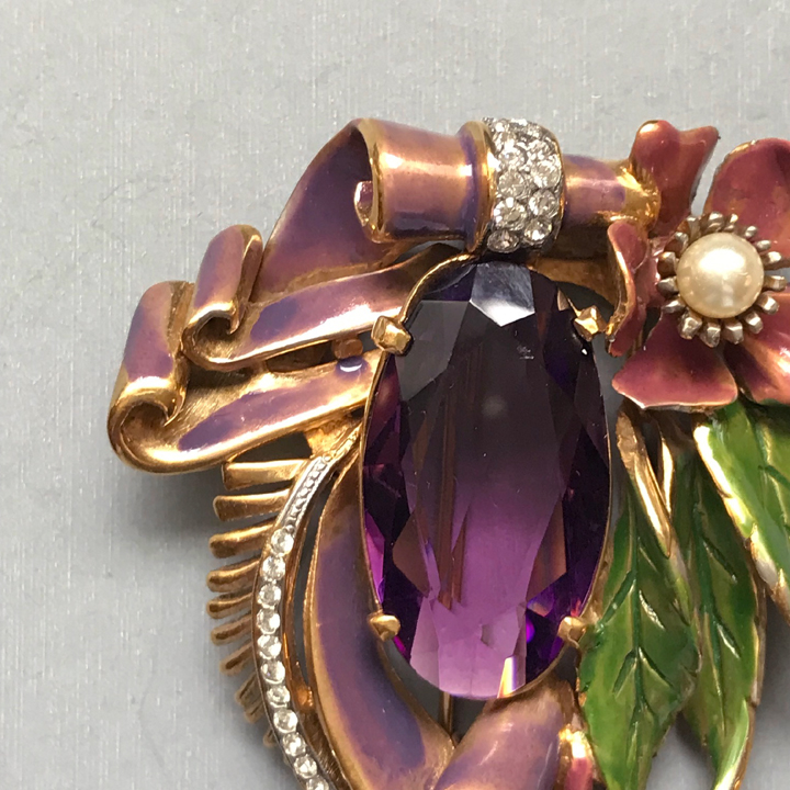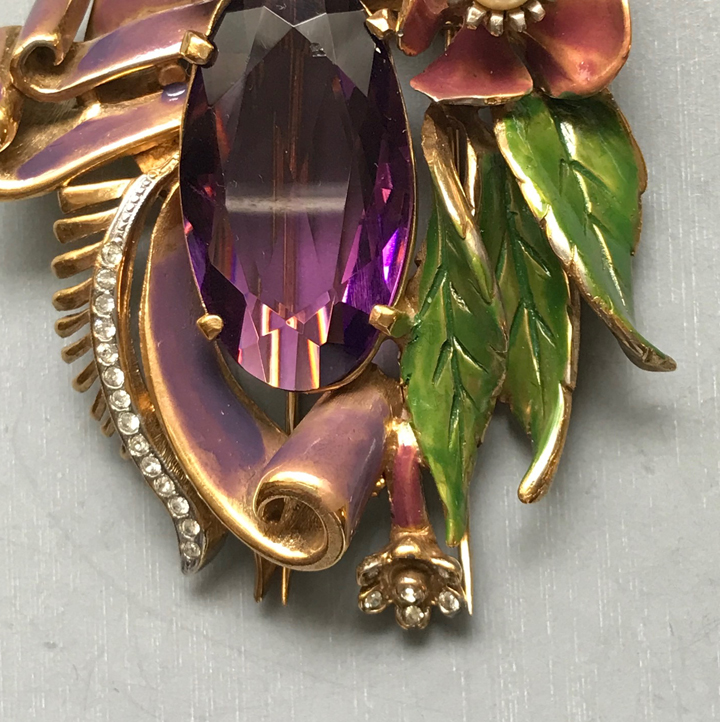 DEROSA colorful 1940s fur clip with lavender, pink and green enamel