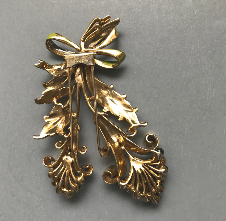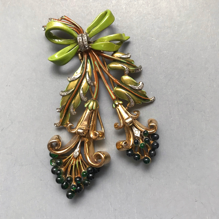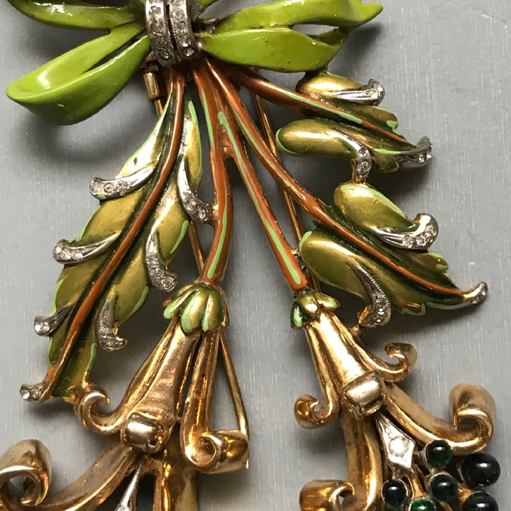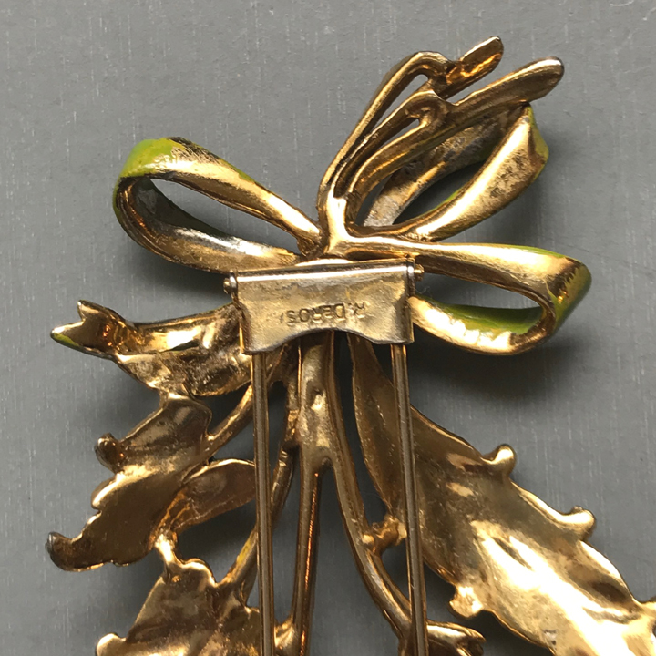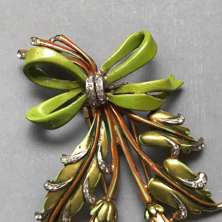 rhinestones as the flowers and green enameled leaves and ribbon.
