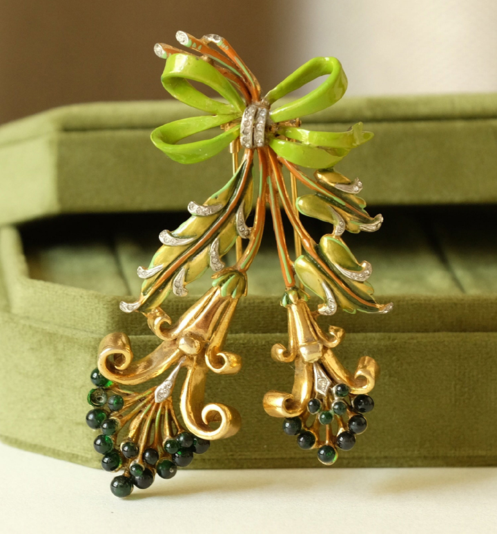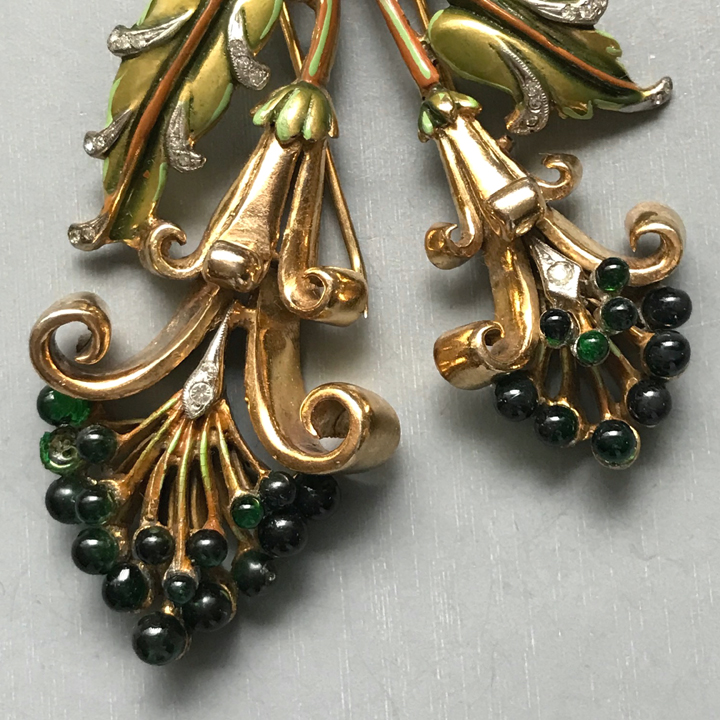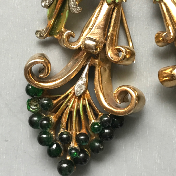 DEROSA outstanding 1940s fur clip with green glass beads and clear