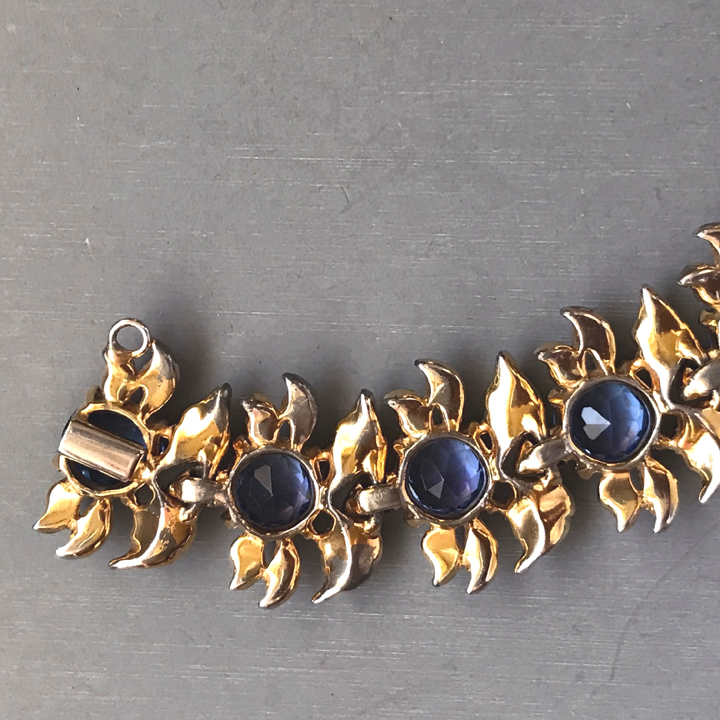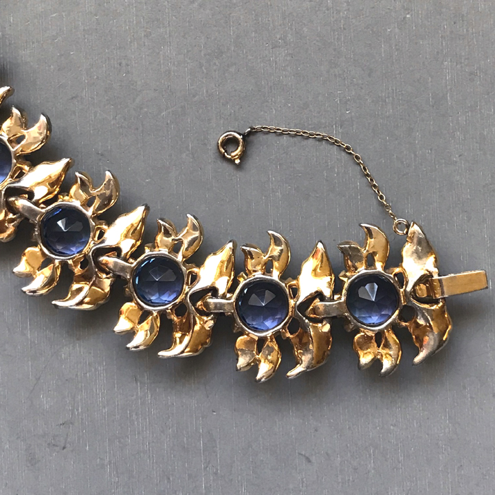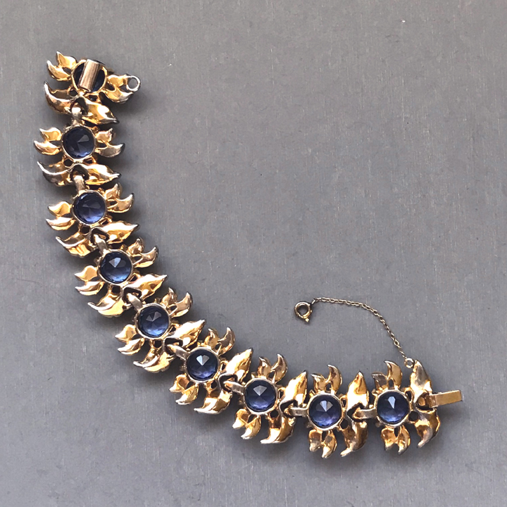 gold plated and hinged bracelet with blue and red cabochons, 8" wearable