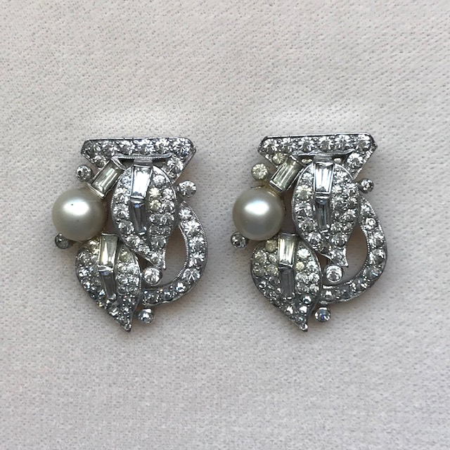 with clear rhinestones and a glass pearl, it is 2-1/2" by 2" and in