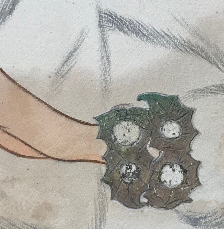 daisy clip and bracelet, 4-5/8" by 6-5/8" on paper, mounted in an 8" by 10" deep green