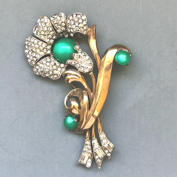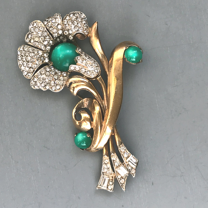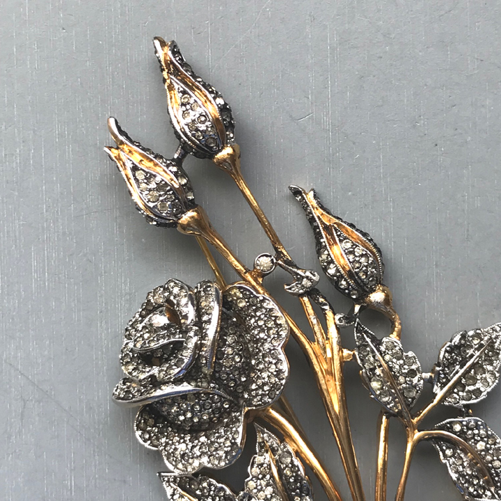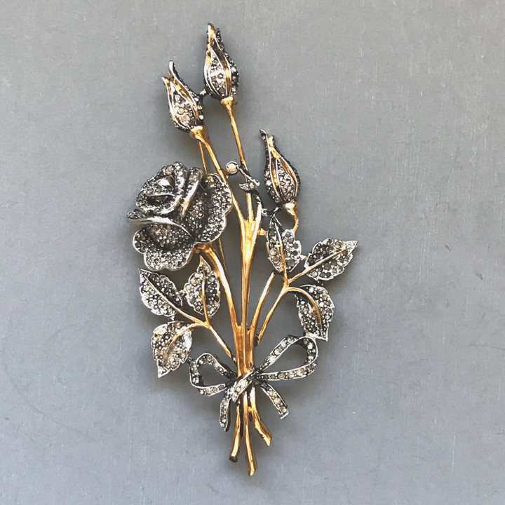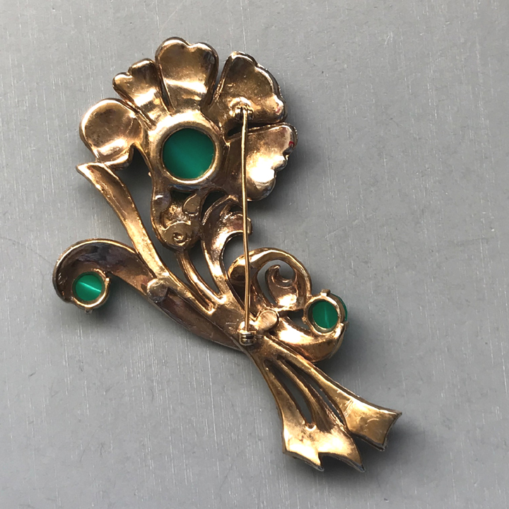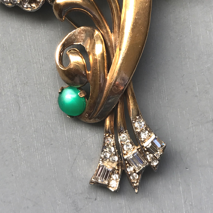 dress clip with antiqued gold tone filigree center, circa 1940, 2-1/4".