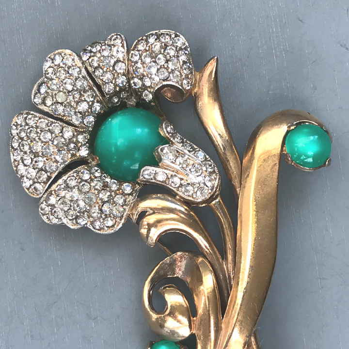 blue and green rhinestones and green pressed glass leaves, 5-1/2".