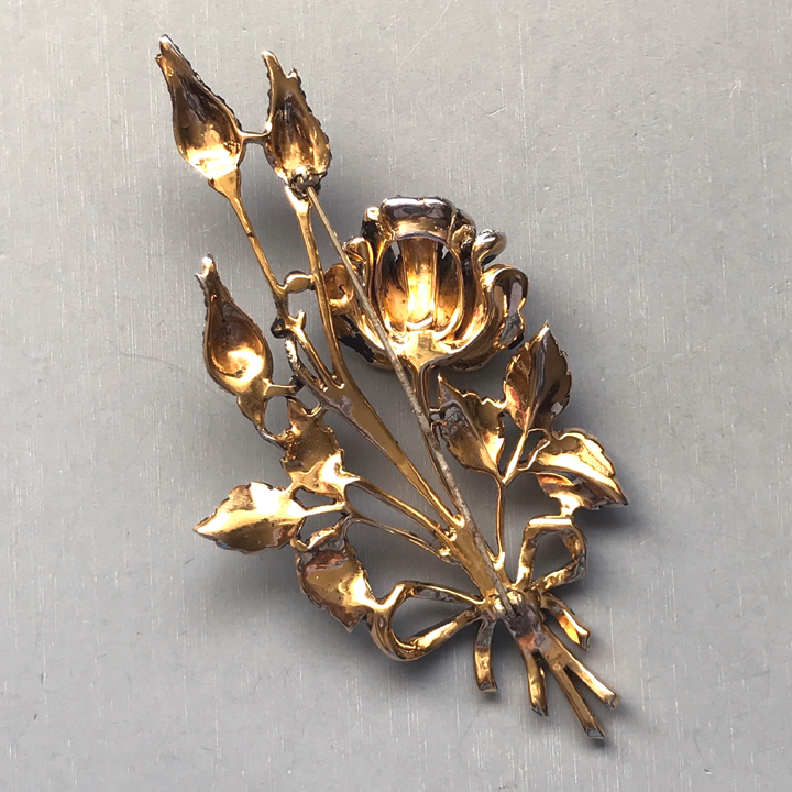 mother-of-pearl leaves and topaz-colored and yellow rhinestones, 4-7/8".