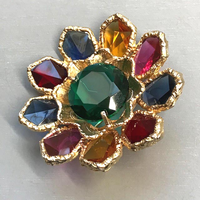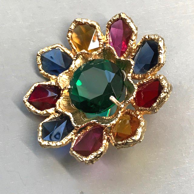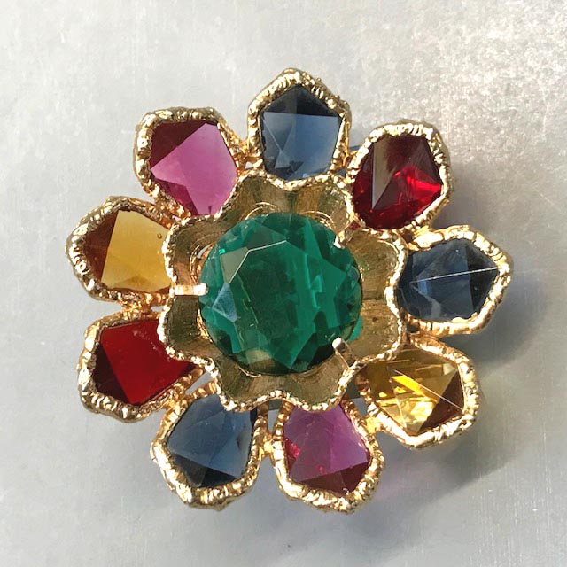 colored rhinestones and aurora borealis brooch set in gold tone, 3".