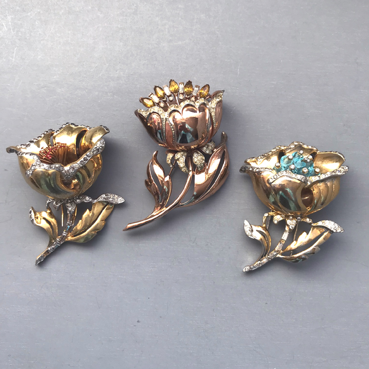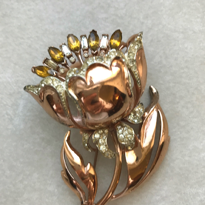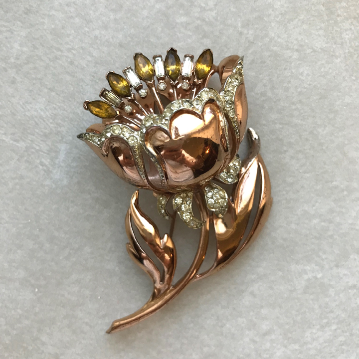 AMOURELLE red rhinestones brooch in japanned setting, circa 1965, 2-3/4". View #X26795 |