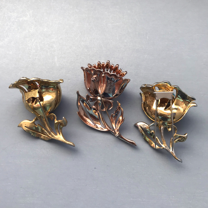 AMOURELLE brooch, with tiny gold tone flowers centered with bright pink rhinestones in a cross motif, lovely detail, 2-3/4". View #X34981 |