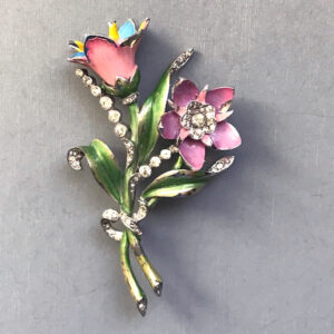 MAZER colorful enameled flower bouquet brooch in pink, lavender, yellow, green and blue with clear rhinestones