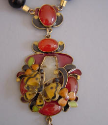 | VEGA Maddox was a California jewelry maker in the 1960-90s. One of the great joys of running a web site is "meeting" wonderful people, including a very generous gentleman named Paul Golden. He emailed me to say: "I met Vega as a kid through my grandparents. She performed with my grandfather, Eddie Jackson, and Jimmy Durante. I enjoyed hearing her reminisce about the old days in show business with my grandparents. She was close to my father as well. "She was part of my Grandfathers act with Jimmy Durante. She would sit in the audience and sometime during the show Jimmy would come out on stage with a VERY small one piece outfit. Of course it was beaded and very red and very small, and he would ask for a volunteer to put it on and perform on stage with he and my grandfather. Vega would jump up and (you know in her hey day she was a large women) and run on stage to put on this tiny little outfit! It got a lot of laughs. She would then come out and perform with them using her "hips" and pushing both of them (Eddie and Jimmy) all over the stage as they danced and sang together." Paul shared many playbills and photographs of those days, and they as well as more Vega jewelry, can be seen HERE. What a treat to know a bit more about the dramatic generous colorful lady who made this wonderful jewelry! Vega Maddux jewelry for sale can be seen HERE.