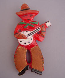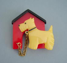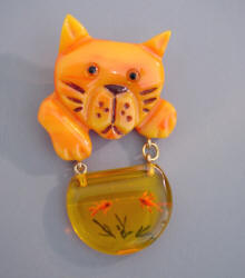 | RON and ESTER SHULTZ have worked with vintage bakelite for almost three decades, and they are the masters of that material. All the work is hand done and all is made of circa 1940 bakelite, nothing new. While Ron does most of the bangles, Ester is the one who designed and carved their wonderful brooches. Whimsical, colorful, cheerful and fun, these works of art are the MOST fun to wear, and they are guaranteed to get comments every time. They sometimes are reverse carved and painted, or laminated, or have other materials added to create the wonderful detail for which they are known. They almost never do brooches any more, so these wonderful pieces are a real treasure. The SHULTZ GALLERY of brooches can be seen by clicking HERE. SHULTZ BROOCHES TO BUY can be seen by clicking HERE