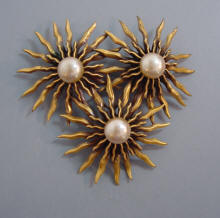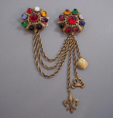 Mr. Joseff died in 1948, and his wife, Joan Castle Joseff has spearheaded Joseff jewelry since that time. Joan Joseff branched out into providing Joseff jewelry for TV stars from the Fifties on, as well as expanding the retail market until her death in 2010. Some vintage findings are still being assembled on a limited basis for finished pieces today, according to Joanne Ball, who wrote Jewelry of the Stars, where many of these pieces are described and pictured. The vintage pieces- 30s and 40s- are marked "Joseff Hollywood" in upper case block letters, either cast in the piece, or stamped in a discreetly small oval plaque which is screwed on or soldered. The more flamboyant script Joseff in a round plaque has been used since the 50s. The JOSEFF JEWELRY GALLERY can bee seen by clicking HERE.
