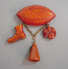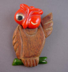| BAKELITE bangles are great fun to wear, but the most whimsical pieces of vintage bakelite are the clips and brooches. Carved, reverse carved, laminated and added to wood and Lucite, they come in an amazing variety. The Google eyed character brooches cant help buy make you smile. Well carved brooches were done as figurals, flower and leaf motifs and abstract designs. Each was done by hand, and each has its own personality! Like the bangles, brooches and clip may be ornamented with painted, brass or resin washed accents. For the GALLERY of BAKELITE PINS JEWELRY please click HERE.