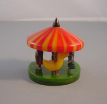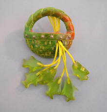| We have a change for this newsletter. This time we are looking for information! We have been fortunate enough to have some wonderfully crafted bakelite by a person named "Adrian", and we have no clue who that is. His work is amazing, as you can see in the photographs on the right. The carousel brooch has a laminated top in slices of red and butterscotch, the little animals inside are absolutely charming, and the whole thing stands only 1-1/2" high, a true miniature. His (or her) designs are creative, and some we have never seen in vintage bakelite.