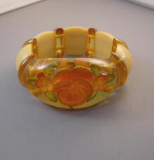 One of my favorite things to wear is BAKELITE, especially reverse carved and in glorious colors. I have collected the reverse carved and painted pieces for years, and have enjoyed wearing and sharing them. I even got to see a wonderful collection of them at the Doyles 2001 bakelite auction, too, and what a mouth-watering assembly that was.