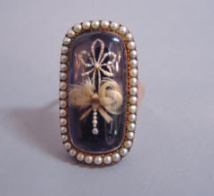 | Small pins like these are often referred to as "lace pins". They were worn not only by women, using them to fasten lace around the collar, but also by men of the Regency era... those who wore velvet jackets, lace-trimmed shirts with ruffles, make-up, wigs and high heels. Examples of this style of dress can be seen HERE. Memorial rings were given both in friendship and in memory. Often made to distribute at funerals, they were also given to family and friends for occasions other than death. These tiny treasures sometimes have bands made of woven hair, but they can also have small compartments for hair in them, too. To BUY these for your own collection, please CLICK HERE. | NEW ADDITIONS