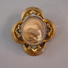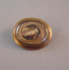 | Whether fashioned by a home crafter professionally by a hair weaver or a jewelry maker, hair jewelry was the height of the romanticism and sentiment that characterized the Victorian era. Some pieces were done as mourning pieces or "momento mori" ("remember you must die"). While some may find this morbid, for the Victorians death was a common and accepted part of everyday life especially due to the higher infant mortality rate of the time and the devastation of the Civil War.  Hair jewelry was not always mourning jewelry, however, as it was also crafted as love tokens from sweethearts, family members and cherished friends. Rings might be engraved with loving messages and memorials either on the face or inside the band, and might also have hidden compartments for the hair. Brooches came in all sizes from the daintiest lace pin to a larger 3" oval meant to be worn at the neck. Watch chains and bracelets often show the most ingenious hair weaving techniques with more than one color of hair often used, as perhaps in a watch chain given by three daughters to their father. To purchase some of this historic jewelry, please click HERE.