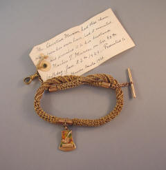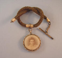 Watch chains made of human hair were popular in the last half of the Victorian era and were worn and treasured for generations afterwards. They were sometimes made as a memorial or mourning piece, but also as a living and loving token from a wife to her husband or daughters to their father. Women wore them as well, both for their intended use as well as for necklaces and bracelets. We have a lovely CDV of a lady wearing one as a necklace at the right of this page.