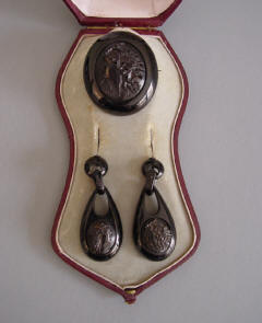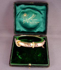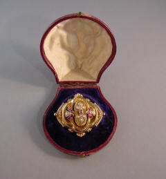 | Since the Victorian era stretched over six decades, many types of jewelry came and went in style. Mass production made jewelry available to the widest number of buyers in the broadest range of designs ever seen before in history. When it came to formal occasions, the "more is better" theme of the Victorian era carried over into how jewelry was worn by royalty and the aristocracy. Paintings of Queen Victoria and other royals at state occasions show multiple brooches, swags, earrings, bracelets and hair ornaments. But the jewelry of the everyday folk is just as collectible and fascinating. It is a lesson in history that enchants us even today. An original fitted box makes a wonderful piece of jewelry even more collectible, and the Victorian boxes are getting harder and harder to find. Often shaped in a whimsical form, these old boxes were fitted inside for a particular piece. Turtle-shaped, made to open into a display stand or center-opening, they are all lined in fabric and fashioned with an eye toward showing off the treasures they held. They are also collectible category in their own right.
