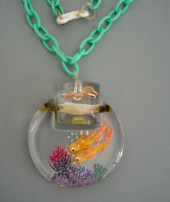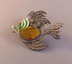 | For many of us, fish in jewelry is the ultimate in whimsy! Whether bakelite or rhinestone, enameled or painted, each piece has a personality all its own. I have always enjoyed the 1940s Staret brooches with big rhinestone bellies, perfect with a "man shirt" and jeans. Carved and painted into bakelite, fish pieces are wonderful accessories to be mixed and matched with other bakelite pieces. And in paste, they can be worn with even the dressiest look. To see all the fish that we have for sale, check our selection at Morning Glory Jewelry.