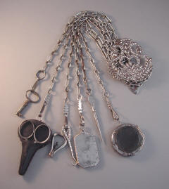 Made in both England and Europe, this style of jewelry fell out of favor for awhile around the turn of the 19th century, but it never falls out of favor with me! I have collected it for years and still do. Since cut steel will rust if it gets damp and is difficult to polish or clean, much of it has been discarded and a relative few good pieces remain today. In general, the smaller the pieces of cut steel used in the jewelry, the earlier the item was. Later jewelry had larger cut steel brads. Whether jewelry, chatelaines or purses, it graces anything on which it is used. We have some wonderful cut steel jewelry, purses and chatelaines for sale right now, and you can buy some for your own collection HERE. You might also enjoy our feature on cut steel by clicking HERE.