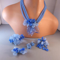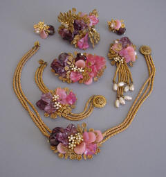 Enjoy buying our sea shell and ocean themed jewelry, perfect for Summer, both by Miriam Haskell and other makers. Just click HERE. | FEATURE: MIRIAM HASKELL ~ Glass Leaves & Intricate Beadwork | MIRIAM HASKELL... the name alone conjures up images of tiny faux pearls and colorful beads, strands of rose montees and glass leaves all fashioned into tapestries of dazzling jewelry. During the early days of her jewelry making in the 1930s and 1940s, most pieces were not signed. Now the hunt for them is inspired by the wonderful sense of design, the intricate craftsmanship and the mystery of what IS and what is NOT Haskell. Our Haskell jewelry is guaranteed to be the real thing, and vintage 1930-60s rather than contemporary as well The list of wonderful designers who worked for her over the years includes Frank Hess, Bob Clark, Larry Vrba and Millie Petronzio and others. Although she passed away years ago, the joy collectors get from her jewelry still lives on. One of my personal favorites are the Frank Hess sets that include big glass leaves, petals and flowers. They were all assembled by hand in American during that time. Delicate yes, but great fun to wear and always attracting attention wherever you go. They are particularly nice to collect along with the Larry Austin advertising art work that illustrated them in shops and boutiques where the jewelry was sold.