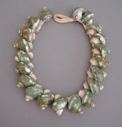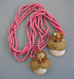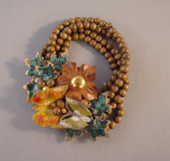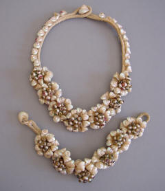 | FEATURE: Miriam Haskell designed by Frank Hess ~ Seashells | Some of the best and most collectible Miriam Haskell jewelry was made in the first decades, when Frank Hess was her head designer. Frank Hess was the head designer from about 1926 to 1960 and his talent was unrivaled. In the early days, Haskell put no identifying marks on their jewelry at all. As a mater of fact it was not marked until about 1947. Today the early unsigned pieces can be identified from vintage art work and advertisements, and by their wonderful detail, hand work and designs. Read more about Haskell Hess jewelry in our article in JEWEL CHAT. There are also two wonderful books about this jewelry that can be purchased on Amazon. There were material shortages that affected the costume jewelry business during World War II, and one of the substitute materials used during that time was natural elements like seashells. Sewn onto fabric bands, incorporated on brooches, and twined around coil bracelets, they made whimsical jewelry. The variety was amazing and the look has the creativity of Hesss pieces.