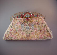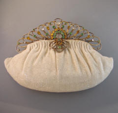 With the holiday festivities coming up, an unusual accessory that will draw lots of attention is a Hobe framed purse with a body often made by Josef. Some have intricately hand-worked and softly colored bodies, and some are more plain. But the brilliant Hobe circa 1950's frames of multi-colored rhinestones make each on special!