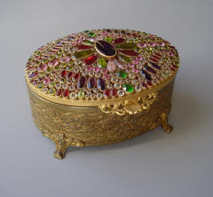 Josef of Paris made fabulous handbags, not all with the Hobe frames. They were beaded in France and then imported in the 1940-50s. A vintage ad for these purses said, "The stitched and beaded body was made by well-known purse maker Josef, and the frame by Hobe, circa 1950." At the bottom, the ad says, "... evening bags by Josef... jewelry to match, bracelets $79.50, pin clips $35.00, earrings $19.75." Next to each purse is a price ranging from $125.00 to $175.00, a lot of money back then! They also made fabulous dresser boxes and compacts, which are very hard to find. We do have one box for sale on our web site right now. To see our available Hobe purses, just click HERE. And this fabulous box at the right will be on the web site soon. Hobe made some of my favorite jewelry, too, and we have some amazing pieces from them HERE, many from pre-1950. To see what's new on Morning Glory, please click HERE.