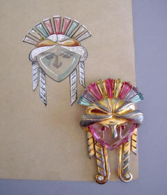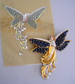 DeRosa seems to have used the design work on paper, at least in the early years. From the notes on some of the art work, each piece was then approved or changed before the jewelry were made. There are about 300 designs in my collection, and we have been able to find the marching jewelry to many of these pieces. DeRosa usually signed their work, but for a few of their unsigned pieces, we were able to identify them ONLY from the art work. The blue winged bird shown here is an example of that. To see some of the wonderful original design illustrations of DeRosa Jewelry, click HERE