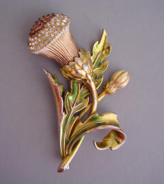 DEROSA JEWELRY 1934-1970s Ralph DeRosa jewelry is known for its complex dimensional design, high quality components and translucent enamel work. DeRosa jewelry designs include floral, figural and retro motifs, and designs inspired by the precious jewelry of the era. DeRosa pieces are not always easy to find, but they are certainly worth the search. This New York City firm was at 404 Fourth Street in New York City and they made jewelry from the mid-1930s until the 1970s. Like many jewelry makers, their 1940s jewelry was the best. One thing that enchants me about this jewelry is the layered three-dimensional design. It's genius shows in so many of their better pieces, such as the purple clip shown here, where each layer stands out from the other. Another is that they didn't made nearly as many of each piece as some of the other companies did, like Coro for instance. They were special, and still are. Actually, the only piece that I have seen several of is a later brooch, which in the shape of a cherub riding pearlized glass waves.