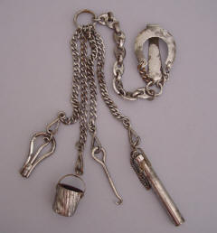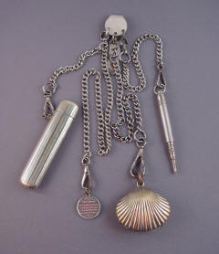 Well-dressed ladies wore "LONG CHAINS", sometimes looped and caught on the bodice with a brooch, sometimes worn full length, and often draped across the entire front of a dress and caught at the belt to be the main ornament. Chains were made in both precious and non-precious metals, and could be extremely simple or ornamented with stones and seed pearls. Some had slides, which have become collectible in their own right. From these chains were suspended watches or lorgnettes, as well as lockets and other useful implements.