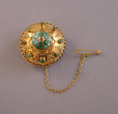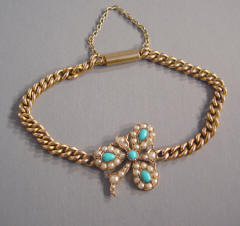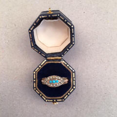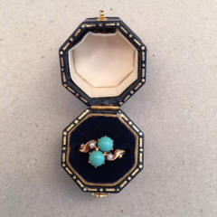 The combination of turquoise and yellow gold was popular during the Victorian era, and the photos shown here show why. According to Wikipedia, the word "turquoise" came about when the earliest of these lovely blue stones was brought from Turkey into Europe around the 16th century. Turquoise was also was mined in many other areas and countries with differences in the fineness, matrix and color in each. More about turquoise can be read HERE. Persian turquoise tends to have little to no matrix, as you can see in the pieces shown here. Turquoise was a popular jewelry stone throughout the Victorian era, and is was sometimes used to symbolize "remembrance" and the forget-me-not. The rings in the shape of a forget-me-not flower are an example of this. We have some lovely examples for sale in the shop right now, and you can buy some for your own collection HERE.