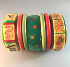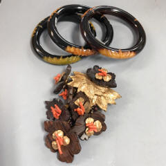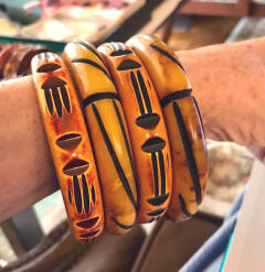 One current trend is the fun of wearing both jewelry and clothing in your own unique way, making your own unexpected combinations. Another is men wearing vintage jewelry! Have you seen Isaac Mizrahi and Zak Posen on "Project Runway"? Bakelite fits right into this trend. For example, stacks of thinner bangles can be combined so that 3-5 can be worn at a time, enabling different carving and color combinations. And it's also interesting to mix bakelite pieces in unusual ways, worn with Victorian black jewelry, for instance, or with large rhinestone brooches. I have one customer who uses her cell phone to document her combinations for future reference. It's a fun way to have a gallery of your own.