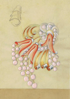 Hand painted illustrations from the De Rosa Jewelry Company seems to have been the first step in the design process. These miniature works of art are from a collection of over 300 similar illustrations that I am happy to own and use as a reference. Several are dated in the 1940's, and many have hand written notes about how each piece should be produced. They seem to have been done by several different artists, as the painting styles and designs vary. Many jewelry designers never worked on paper first, but for those who did, these illustrations are illuminating as to the thought processes and design sense that went into creating this amazing jewelry.