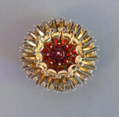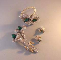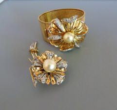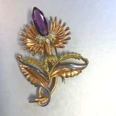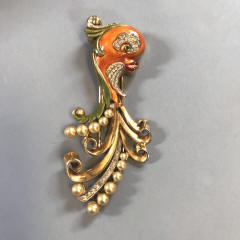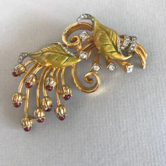 Ralph DeRosa jewelry is known for its three-dimensional layered designs, high quality components, and translucent enameling. DeRosa jewelry designs include floral, figural, retro motifs, and designs inspired by the precious jewelry of the era. DeRosa jewelry is not easy to find because they didn't make many of each style, but is certainly more than worth the search. After years of collecting and selling this wonderful brand, I have found that the majority of their pieces were signed, so beware unsigned attributions where there is no reference material to substantiate it. This New York City firm was at 404 Fourth Street in New York City and made jewelry from the mid-1930's until the 1970's. Like many jewelry makers, their 1940-50's jewelry is the best in my opinion. DeRosa is one of my very favorite makers and I collect it myself.