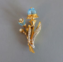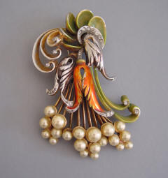 If you are also a serious collector, one of the best things about this maker is that not many pieces seem to have been made. Many of the pieces shown below are the only ones I have seen in all the years I've been handling vintage jewelry, and that's a long time. One exception is the cupid riding on a pearlized cloud pin, which I see very often. An example is shown here on this page. To me, it much less interesting than most other DeRosa pieces.
