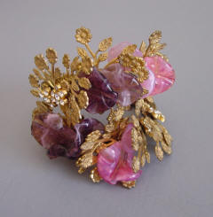 Frank Hess went on to other jewelry ventures in about 1960, but the legacy of unique talent he left behind delights collectors and jewelry wearers to this day. When Frank Hess was Miriam Haskell's head designer, he made some of the most amazing pieces of jewelry. Some of my favorites are the ones that include glass petals in beautiful colors. These were some of the materials used during the 1940s WWII years and for a bit after. Combined with the intricate glass bead work, they make for a wonderful look unique to Haskell at the time.