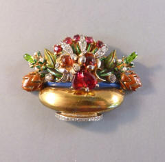 Ralph DeRosa jewelry is known for its three-dimensional layered designs, high quality components, and translucent enameling. DeRosa jewelry designs include floral, figural, retro motifs, and designs inspired by the precious jewelry of the era. DeRosa jewelry is not easy to find because they didn't make many of each style, but is certainly more than worth the search. After years of collecting and selling this wonderful brand, I have found that the majority of their pieces were signed, so beware unsigned attributions where there is no reference material to substantiate it. This New York City firm was at 404 Fourth Street in New York City and made jewelry from the mid-1930's until the 1970's. Like many jewelry makers, their 1940-50's jewelry is the best in my opinion. DeRosa is one of my very favorite makers and I collect it myself.