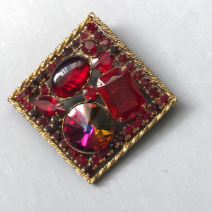 BRILLIANT and beautiful red and purple rivoli, rhinestones and cabochons in a square brooch