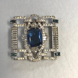 DEROSA slightly curved dress clip with deep blue square invisibly set rhinestones and clear rhinestone pave