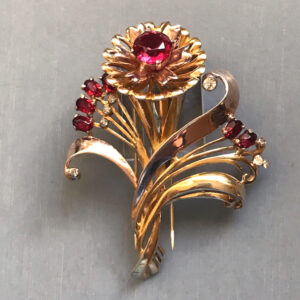 DEROSA flowers and ribbons fur clip with red and clear rhinestone flower in a gold plated sterling silver setting